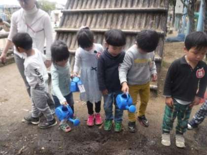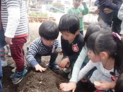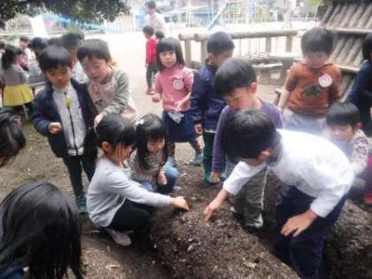 先日,3歳児と4歳児で畑にジャガイモを植えました。