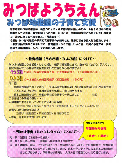 新型コロナウィルス感染拡大防止のため,みつば幼稚園は臨時休業中です。
