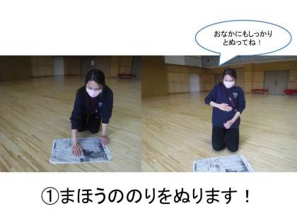 のりをお腹と新聞紙にたっぷりとぬって,くっつけます。
