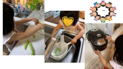 豆ご飯には少ないかなと思いながらも、豆ご飯がいいとのリクエストで、豆をむいて、お米を入れてご飯を炊きました。少しずつお手伝いをしてくれるようになって、嬉しいです。