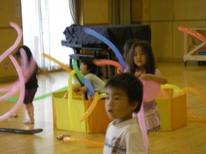 遊戯室に入ってきた子どもたちは,大喜び。まずはたくさんの風船を集めることから始まりました。マジックバルーンや普通のゴム風船を持てるだけ持って満足気でした。