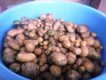 また,昨年度植えたじゃがいもを収穫すると,色々な大きさや形があることを面白がり,たくさん収穫できたことを喜んで「じゃがいもフィーバーや」と話す子もいました。じゃがいもの他にも,たくさんダンゴムシを見つけるなど,収穫以外の発見も喜んでいました。昨年度のもも組(現ばら組)の子どもたちと一緒に植えたことを覚えていたことから,「ばら組さんにも見せてあげよう」という声が上がり,タライの中にじゃがいもを入れていきました。