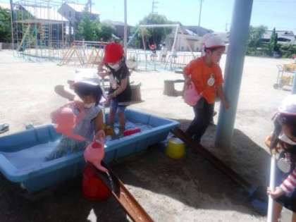 たらいの中から水を流していたAちゃんは,「ここ(といの端)にじょうろを置いたら,綺麗に水が流れるよ」と水を流す中で気付いたことを教えてくれました。