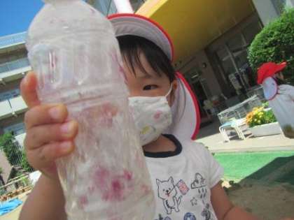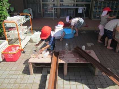 園庭ではサッカーをしていたお友達やバッタを見つけたお友達もいました。水遊びや泥遊びも引き続き,全身びしょ濡れになって楽しんでいます。