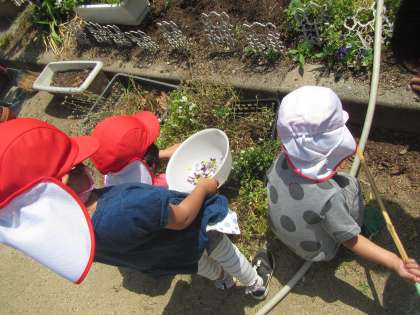 季節が移り変わり,ビオラも終わりかけになってきました。遊びに使ってもいいよとお花をたくさん集めてきた子どもたち。