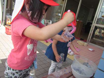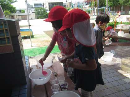 水遊びをしている友達の近くに『お花のジュース屋さん』をひらきました。