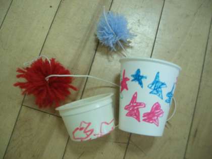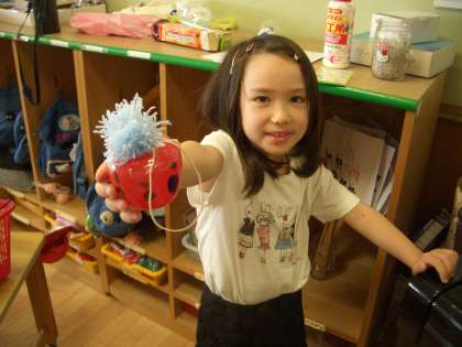 子どもたちは毛糸でポンポンを作りプラスチック容器につけるなど,けん玉つくりに奮闘していました。