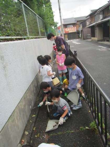 日ごろ,園の職員が門の周りを掃除したり,ご近所の皆さんが周辺の門掃きをされているので,そんなにごみは落ちていませんでした。少し前に振っていた雨に打たれた花や葉が落ちていました。