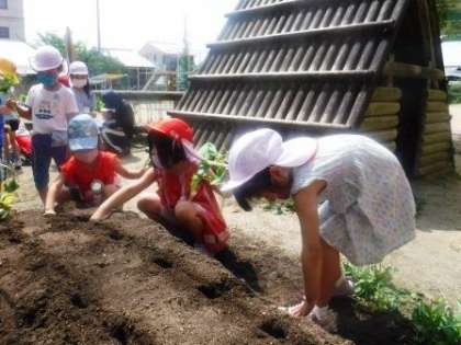 今日はゆり組の子どもたちがさつまいもの苗を植えました。グループで育てている野菜の苗と違い,寝かせて植えるということに試行錯誤しながら取り組んでいました。