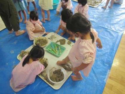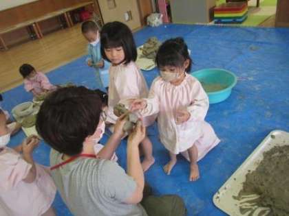 先日絵の具遊びをした時にバットの中で手をこねこね…と感触を楽しむ姿があったので,今日は土粘土をして遊びました。可塑性のある素材で様々な試しもでき,様々な感触も味わえる素材です。