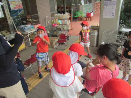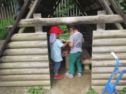 砂場ではごちそうをつくって,三角屋根の小屋にせっせと運んでいました。「先生も食べて!」とみんなでオムライスやケーキを食べました。隣には色水コーナーがあったので,「オレンジジュースどうぞ」とジュースに見立てて,ジュースパーティーも楽しみました。また,みんなでパーティーしようね!