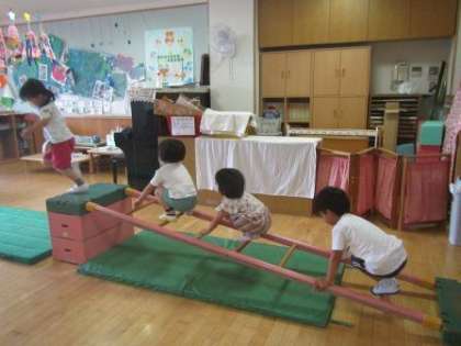 「私たちそんなんできるで!」「簡単やもん!」と見せてくれる4歳児が一緒に巧技台で遊びました。