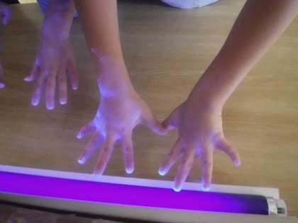 手洗いを終え,ブラックライトに当ててみると,爪の間や手首,指の間などが白く光っていることに子どもたちは驚いていました。何度か洗い直して段々と光る場所がなくなってくると,ピカピカになった!ととても嬉しそうな様子でした。