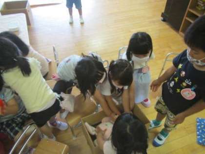 初めは先生が「じゃあ病院に連れて行ってあげなくちゃね」と言って,画用紙の包帯を巻いたり,薬を塗る真似をしたりして「もう大丈夫ですよ。お大事に」と言ってそのぬいぐるみの手当をし,Aちゃんと遊びました。