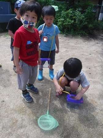久しぶりに天気がよく,子ども達は外で遊んでいました。すると「ミンミン」とセミの声が聞こえ,虫が大好きな子どもは,虫取り網をもって早速でかけていきました。
