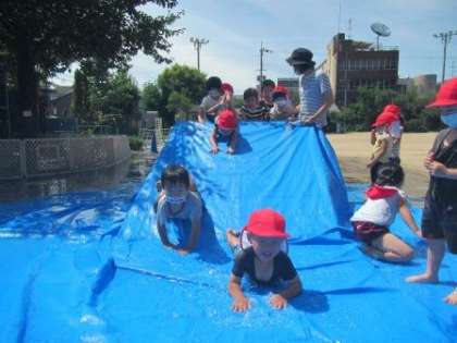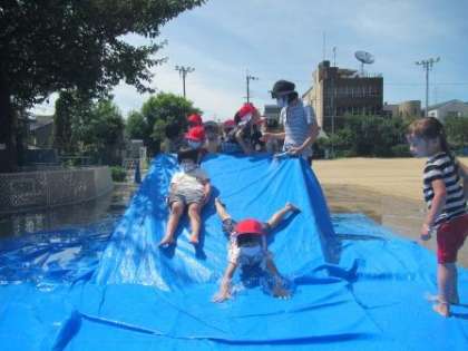 今日は1学期最終日でしたが,先生お手製のウォータースライダーで遊びました。「きゃー,楽しい!」「プールみたい!」と大興奮でたっぷりと楽しみました。