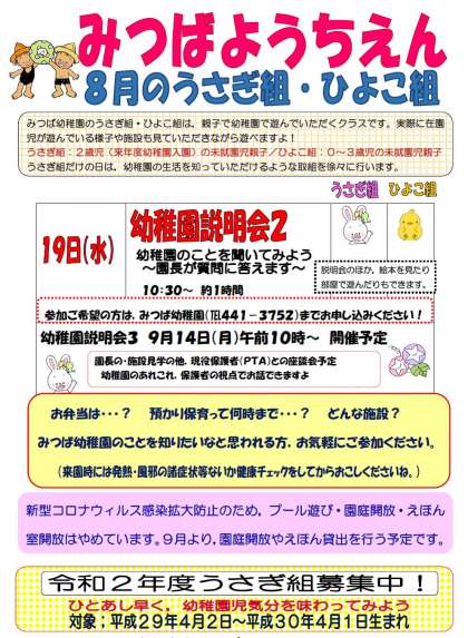 8月の教育相談(うさぎ組・ひよこ組)では19日(水)に幼稚園説明会2を中心に行います。(施設見学も行います)