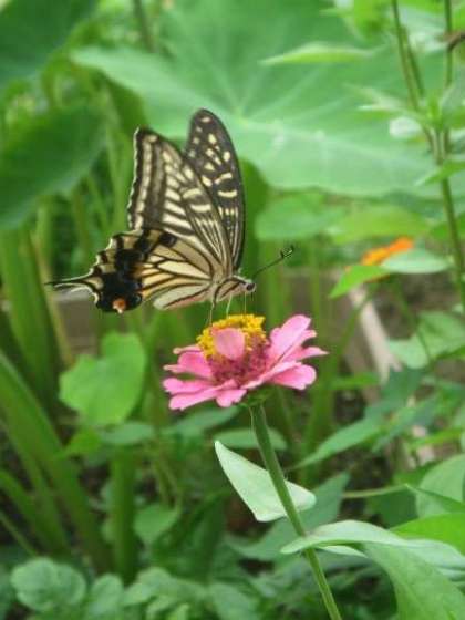 雨の多い7月でしたが,百日草が次々と咲き,チョウも蜜を吸いにやってきています。