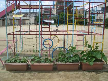 園庭が緑のカーテンで涼やかになればいいな,と願っています。
