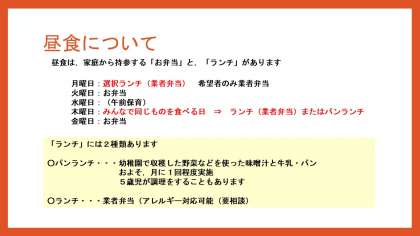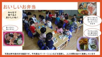 幼稚園から提供する昼食では,家庭の味付けと違う味わいを経験できます。友達と一緒のものを食べることも嬉しそうです。
