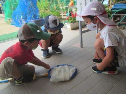 なかよしタイムにやってきた子どもたちと一緒にカマドウマの様子を見たり,外に放してもう一度虫捕り網でつかまえて見たりしました。