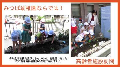 そんな中ですが,少しでも施設を利用される皆さんに元気を届けたいと思い,6月にゆり組(5歳児)の子どもたちが,施設の花壇に,幼稚園で育てた花の苗を植えました。