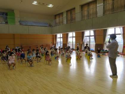 今日は2学期の始業式です。密を避けるため,4歳児5歳児と,3歳児に分けて式を行いました。子どもたちも幼稚園が始まることを楽しみにしていてくれたのでしょう。マスクの上からでも生き生きとした表情や思いが伝わってきます。園長先生から,友達と楽しく安全に遊ぶためにどのくらいの距離をとったら良いか教えてもらいました。引続き,新しい生活様式を意識しながらの幼稚園生活になりますが,“今だから感じられること”を大切に子どもたちと過ごしていきたいと思います。