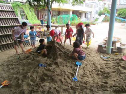 早速,3歳児がやってきて砂の山に登って遊び始めました。