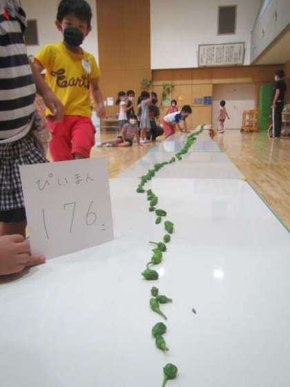 (100個を超えたあたりから,どんどん長くなっていくピーマン行列を見て,子どもたちは大興奮でした。