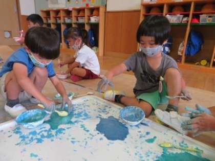 朝登園してくると,お姉さん先生が,色のついた魔法の水と白い魔法の粉を準備してくれていました。