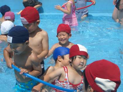 友達と息を合わせてもぐったり,友達がうまく泳げるようにひっぱってあげたり,友達のもぐる様子に合わせてフープの高さを変えたりしています。