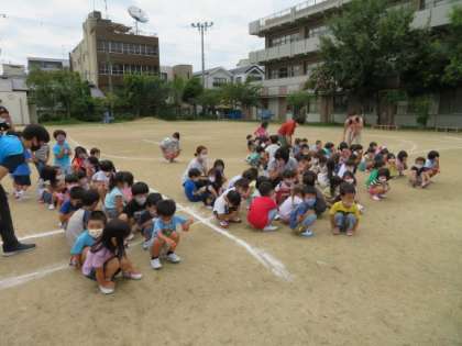 前回までの避難訓練では,各保育室で話や放送を聞いた後,4・5歳児は園庭に避難し,3歳児はその様子を見ていたのですが,今回は,3歳児も園庭に避難しました。