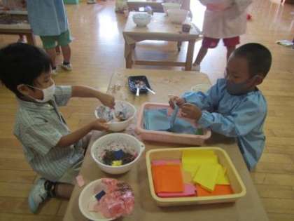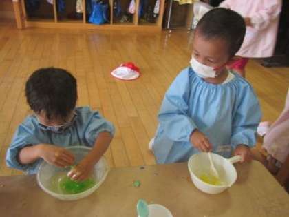 2学期も絵の具・片栗粉・砂・のりなど様々な感触を楽しんでいます。