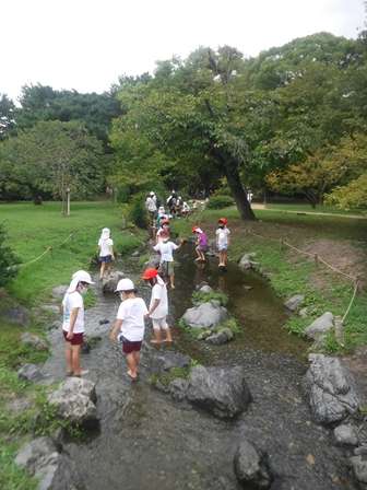 早速,出水の小川で川遊びです。少し冷たい水が心地よく,上流から下流まで歩いたり,石を拾ったり,石を使ってお店屋さんごっこしたりしていました。