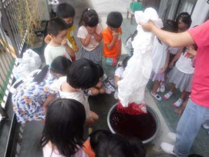 昨日ゆり組が輪ゴムを巻いた布を赤い液に浸けました。