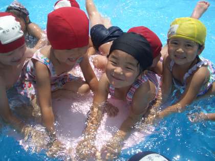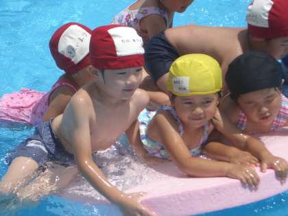 プールの端までつくと,ばっしゃ〜ん!!とみんな水の中に落っこちて,またたくさんのお友達が乗り込んで出発していきます。