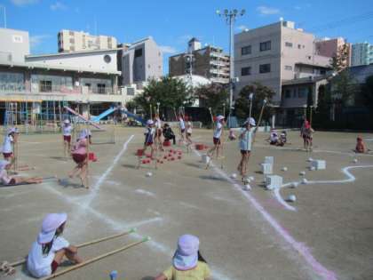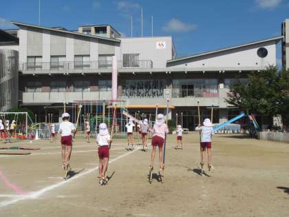 「空中乗りもできるようになったよ!」と,背もたれや台を使わずに竹馬に乗れるようになったことで,外でも自在に竹馬に乗って遊んでいます。
