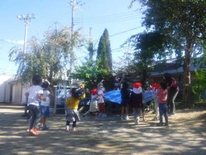 園庭にあるザクロがたわわに実りました。ばら組(4歳児)の子どもたちで,ザクロをとることにしました。とても高いところにあり,手では届きません。「はしごがいる」「はさみで切ろう」「ザクロを入れる籠がいる」「落ちてきたら,大きなビニールでとるの(受け止める)」など,子どもたちがいろいろなアイディアを考えました。