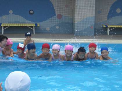 離れたところでは,女の子が2人で代わりばんこに手をひいて,相手のお友達をひっぱって泳がせています。