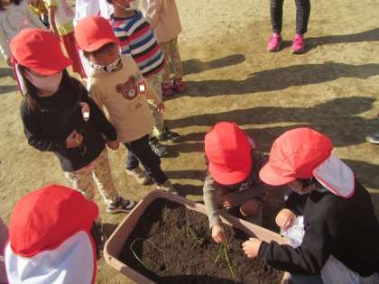4歳児のばら組と3歳児のもも組,たんぽぽ組の子どもたちで,タマネギの苗を植えました。昨年,自分達でも植えた経験のある4歳児が,3歳児に植え方を伝えました。