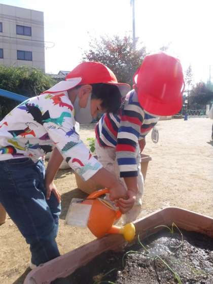 初めての経験にドキドキしている3歳児の手を優しくにぎり,「ここに土をかけてね」と声をかけたり,「見てて」と自分のしている姿を見せたりしていました。水やりでは,水道でジョウロに水を汲んで渡してあげたり,一緒にジョウロをもって水をあげたりして,4歳児はちょっぴりお兄さんお姉さんの顔になっていました。