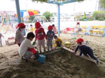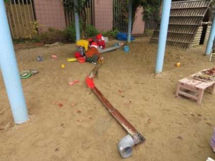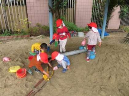 昨日は砂山にたてかけた塩ビ管の出口を砂で塞ぎ、水を入れてその水が一気に流れ出すまでのスリル感を味わったり,水が流れ出すと「わーっ!!!」「キャー!」と大騒ぎしてその面白さを共有するという遊びでした。なんとも嬉々とした表情で遊んでいた子どもたち。