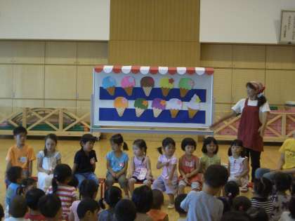 先生扮するアイスクリームやさんに,イチゴアイス,メロンアイス,チョコアイス・・・と様々なおいしそうなアイスが出てきます。そこにトッピングされているラムネにお誕生の子どもの名前が書いてありました。