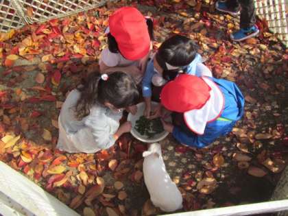 園庭の端に生えているクローバーやタンポポなどの葉を探して集めて,ちぎってつくったごちそう。それは,ウサギのゆきちゃんのごはんでした。