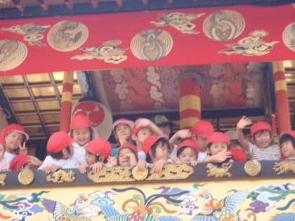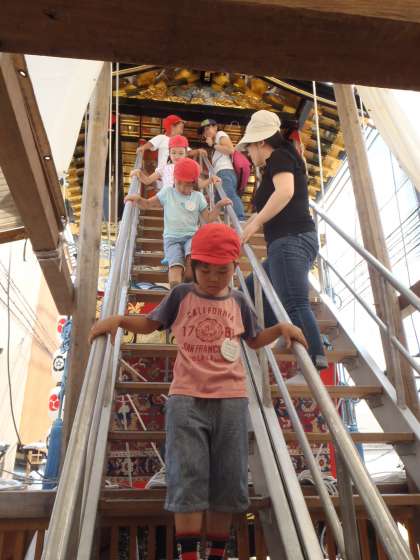 菊水鉾は,2階から渡れたのですが,岩戸山には階段がかかっていて,その階段を上がり下りしなくてはなりません。階段を上手に上がりきり,岩戸山にものりこむことができました。下りる時には,ちょっぴり緊張しながらの姿がありましたが,子どもたちは大満足の様子でした。