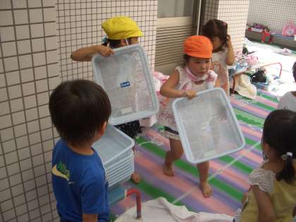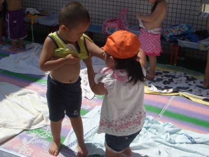 そこへ3歳児の子どもたちが水着に着替えるためにやってきました。