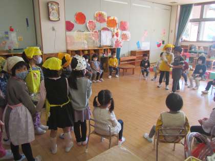 他のクラスに配り終えた後には,ゆり組だけの特別な味付けでポップコーンを楽しんだ子どもたち。ポップコーンと言えば“映画”を連想する子どももいて,遊戯室を暗くして「映画館みたい!」と雰囲気も味わいながらみんなで美味しく食べました。