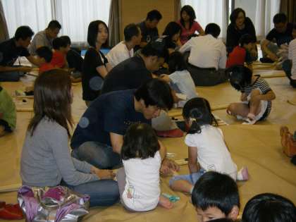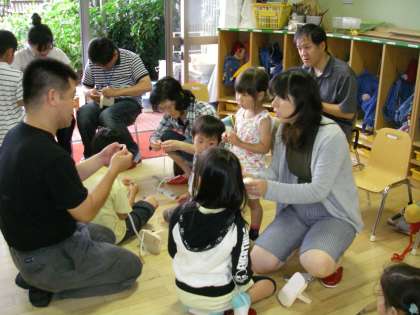 4歳児,5歳児は日頃の遊びの姿を少し見ていただいた後,親子で4歳児は一本歯げたを,5歳児は竹馬を作りました。お家の方が作ってくださっているのを横で見ていたり,できることを手伝ったりしている子どもたちの顔はとても嬉しそうで,またとても