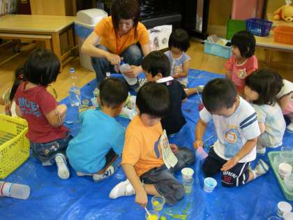 3歳児の子どもたちにとって初めての日曜参観日。たくさんのお家の方に見守られて嬉しいやら,恥ずかしいやら・・・。いろいろな遊びを楽しむ中で,スライムでも遊びました。これまでにも絵の具や石鹸,のりなどいろいろな感触遊びを楽しんできましたが,またスライムの感触は違っています。スライムには,色や不思議な水,おもしろい感触など魅力的なことがいっぱいでした。