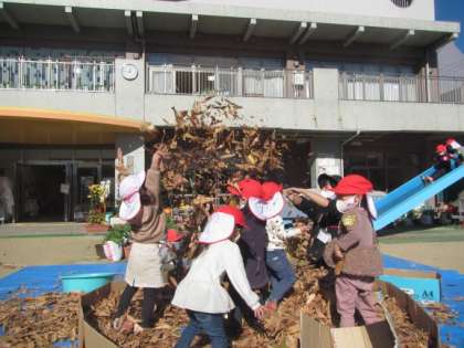 先日4歳児がしていた落ち葉のお風呂。3歳児もやってみたくて,たくさん落ち葉を集めました。